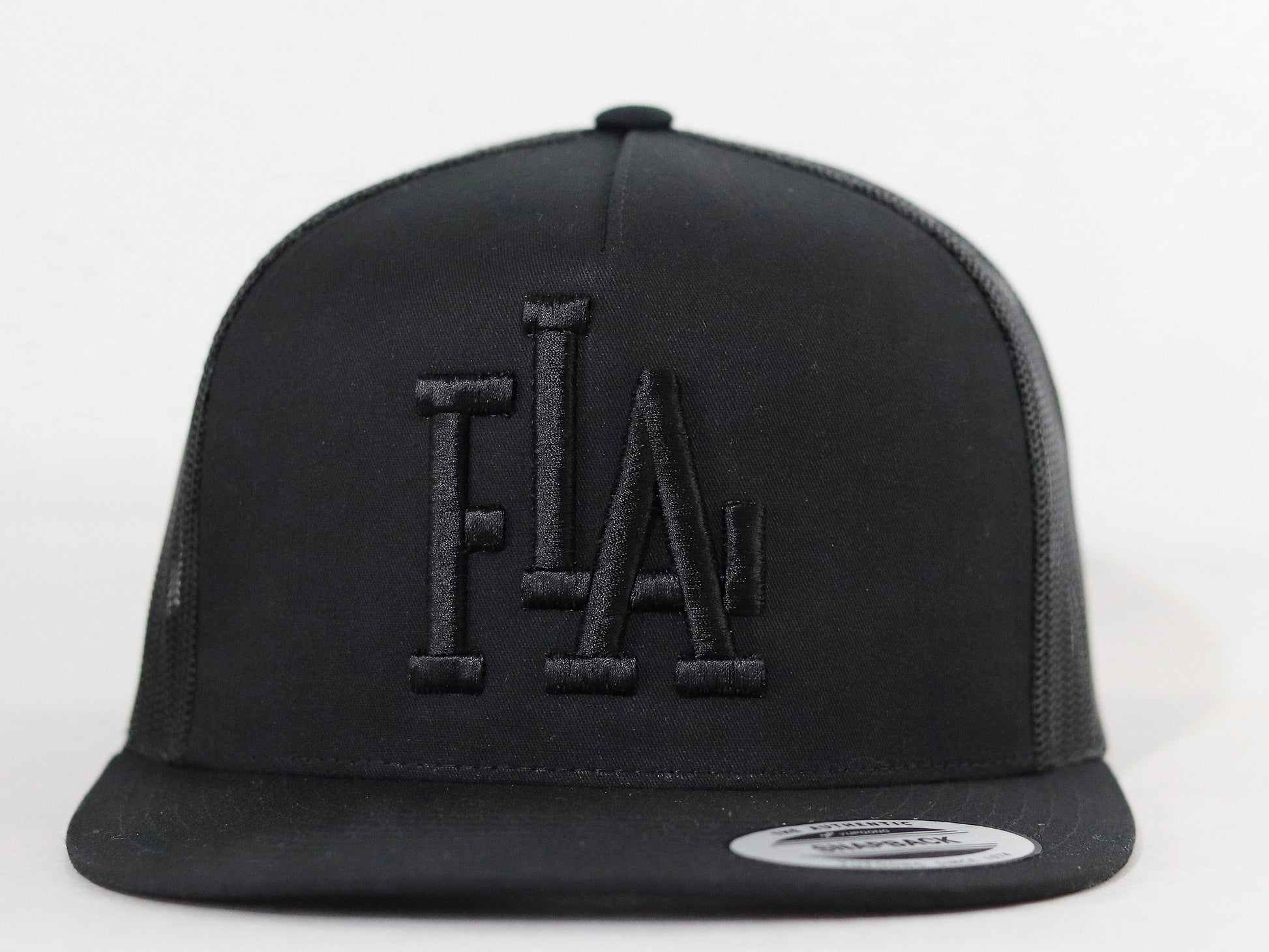This all-black mesh trucker hat features a high-contrast puff embroidery of the bold “FLA” interlock—clean lines, street-inspired, and unapologetically Florida. Built on a structured snapback with a flat visor and classic mesh back for breathability. Whether you're repping the state or just vibing with the look, this lid speaks loud without saying a word.
